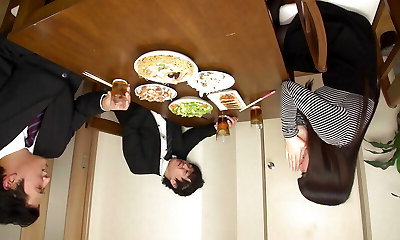 Japanese milf slut gives her pussy to her hubby's coworker at dinner time!