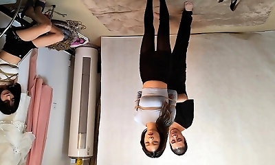 4'8'' 142cm 9 Month Preggo Chinese MILF getting rubbed all over with baby oil - Double cam view from below and in front